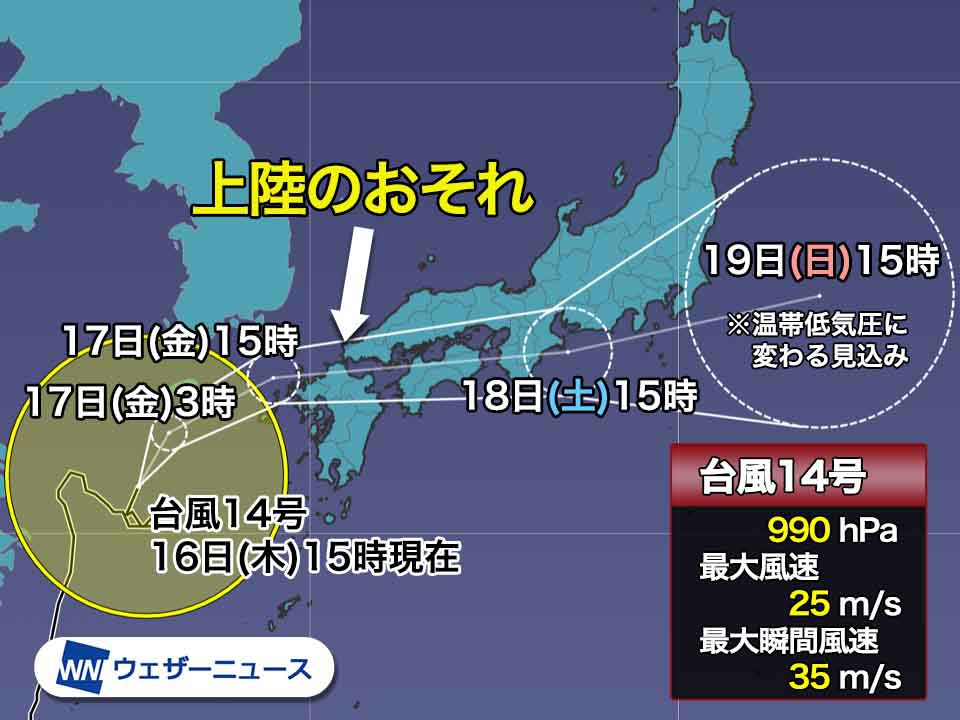 ■台風14号 明日午後にも上陸のおそれ 進路の九州から関東は大荒れに