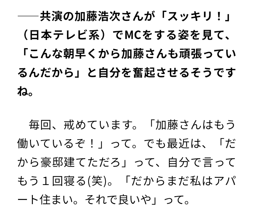 94 名前 : 暇つぶしの名無しさん投稿日:2021年10月01日 21:55 ▼このコメントに返信 光浦は浮き沈みの激しい業界を生き抜いてきただけあってトークのセンスあって好き 文章も感性が独特で人生の渋みもあって読ませる内容だなと思った 高学歴と聞いてなんか納得