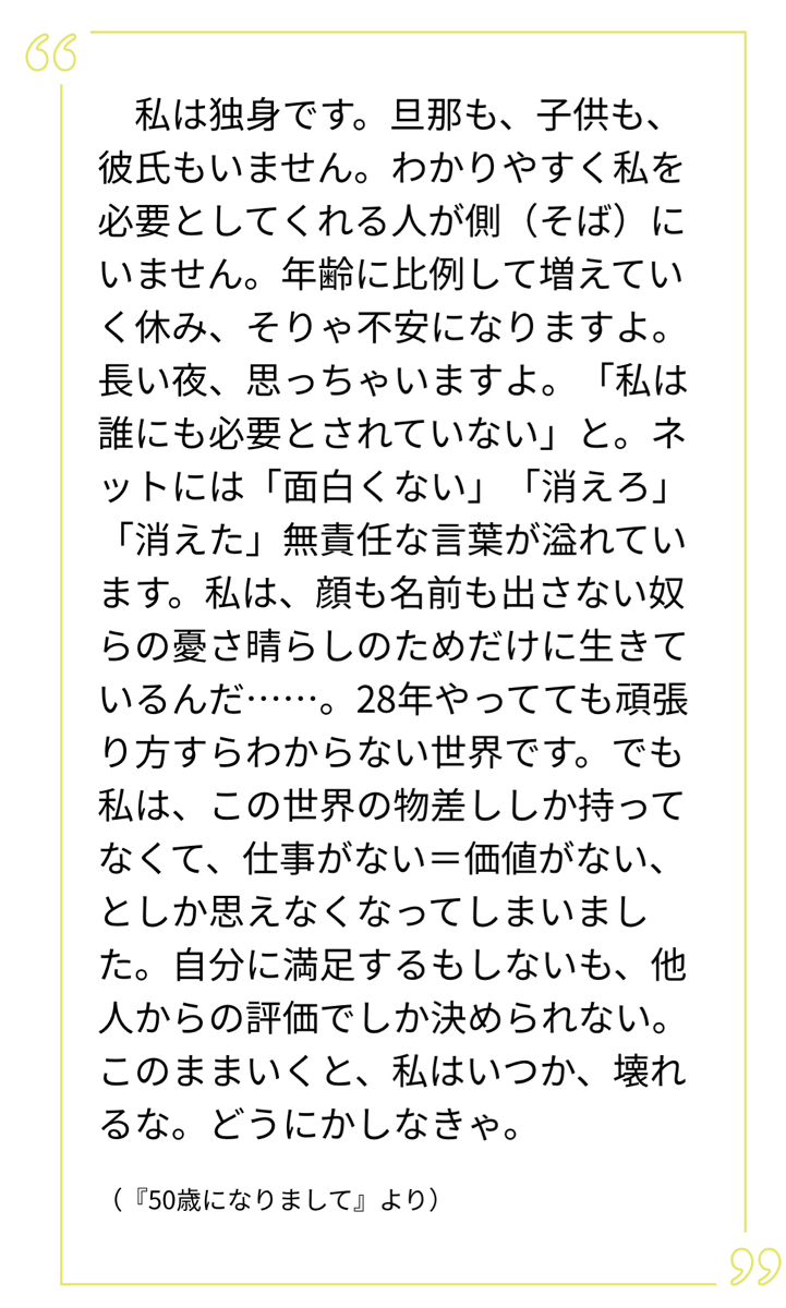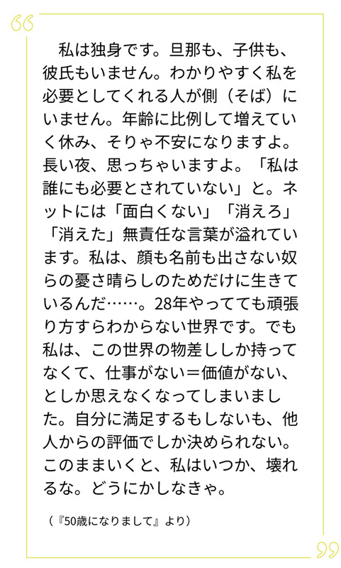 この人50歳独身だからって下卑してるけど、主婦でほんとは自由に海外に住みたいとかこのご近所から解放されたいと思ってる既婚も山程いるよね。だけど結婚してるから自由になる勇気もないし、身軽な独身だからこそできるから好きなこと沢山やるべきだよね。しかもお金もあるしやっぱ独身既婚関係なく世の中金よ。綺麗事いっても夫婦の殆どの喧嘩の原因は金。