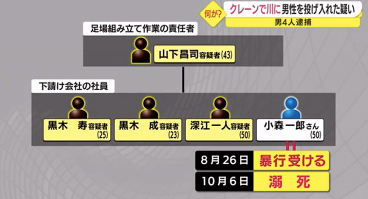 暴行を目撃した関係者によると、容疑者らは男性の腰の命綱付きベルトにクレーンの先端を引っかけ川の上で振り回したり、水に漬けたりしていた。川から岸へ上がろうとする小森さんを突き飛ばす様子も見られた。殴る蹴るを含めた暴行が、工事の休憩時間など一日に数回に及ぶこともあったという。