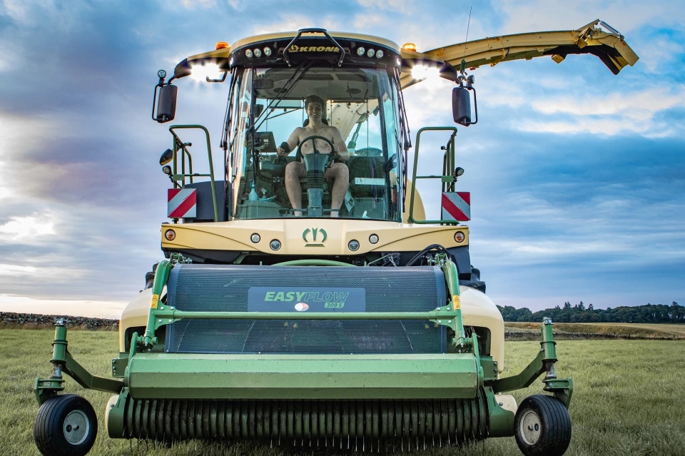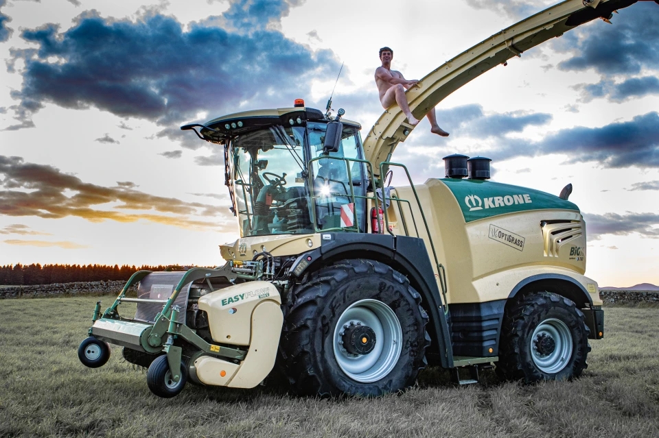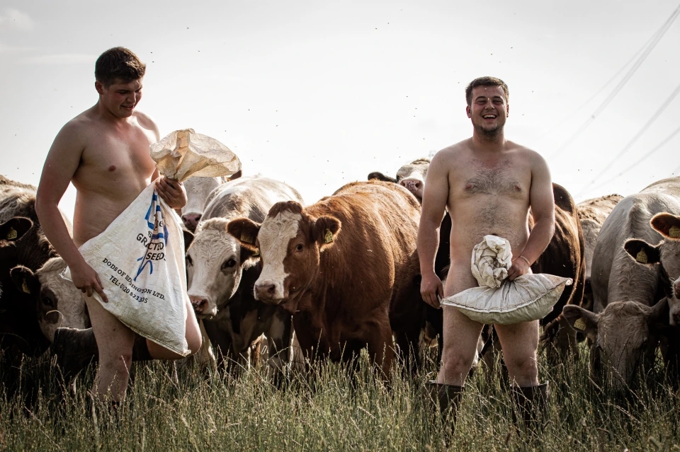 若いスコットランドの農民クラブは、チャリティーカレンダーを盛り上げるためにトップレスで牛に餌をやったり、裸でトラクターにまたがったりします。
