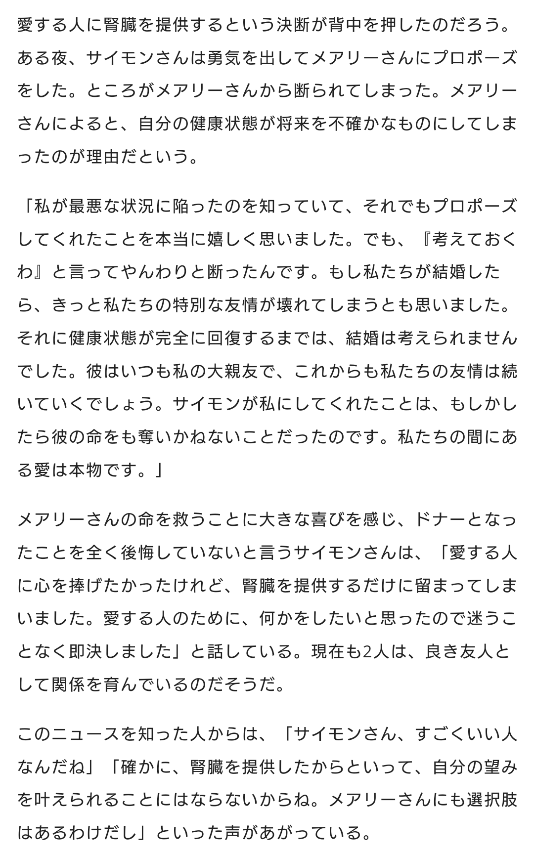 親友に腎臓提供した男性、その後プロポーズするも断られる(英)