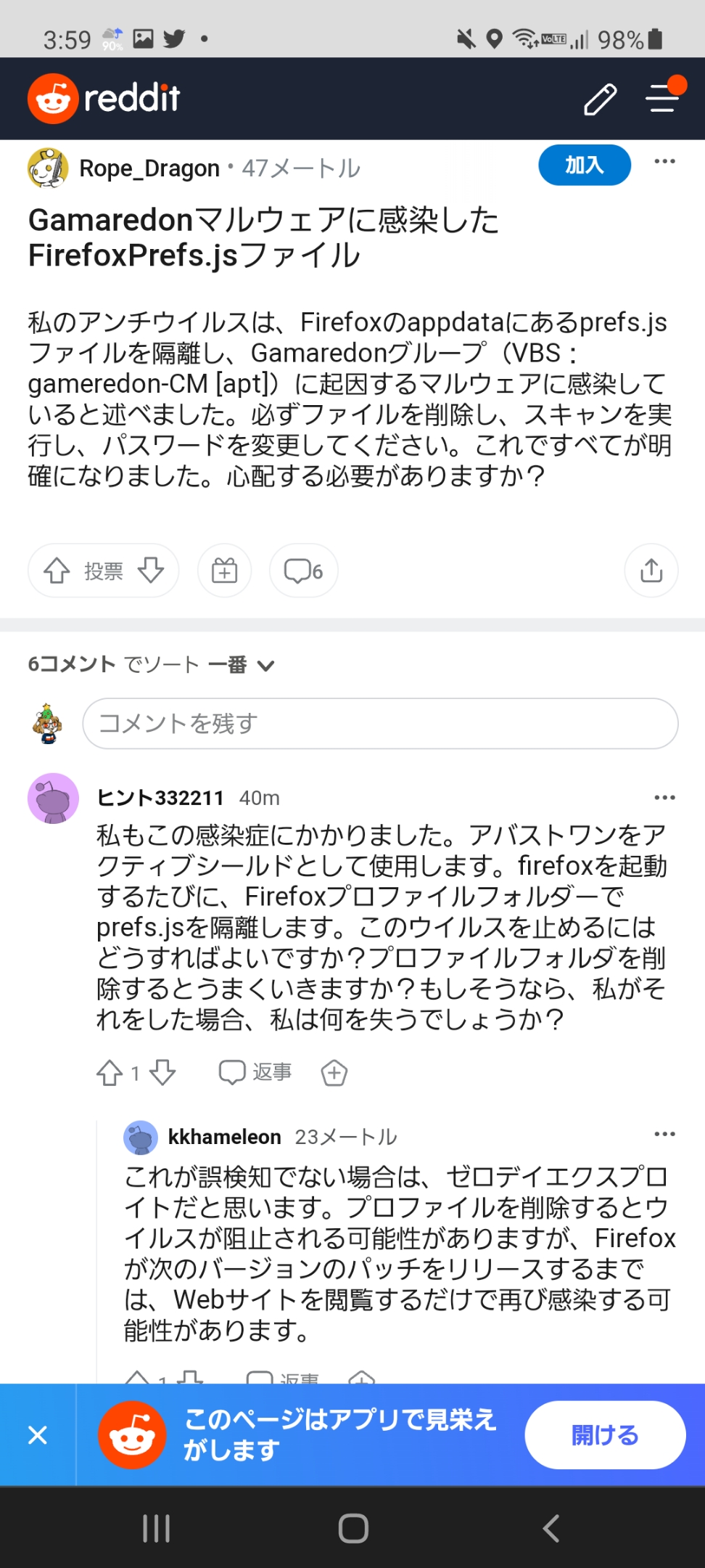 110 名前 : 暇つぶしの名無しさん投稿日:2022年03月23日 23:22 ▼このコメントに返信 一部の連中がavastの誤検出で火狐が使えなって