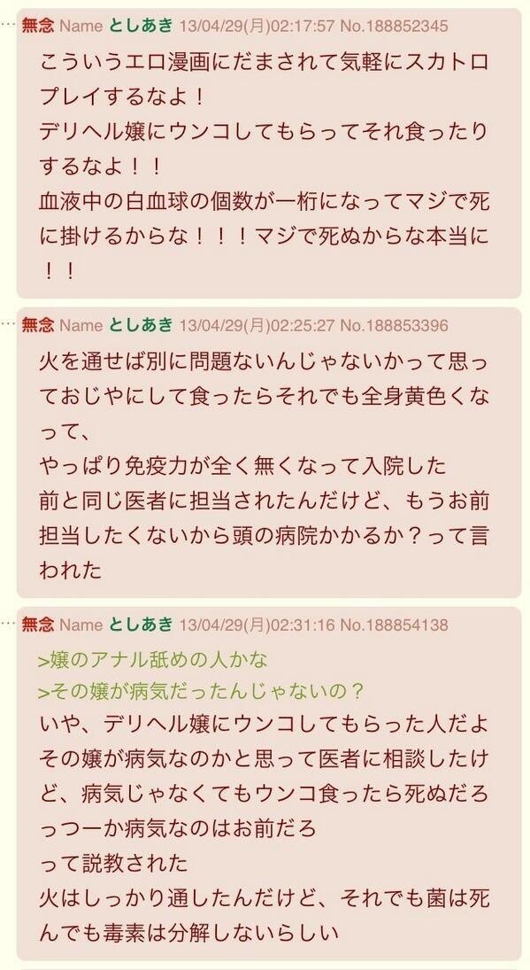 55 名前 : 暇つぶしの名無しさん投稿日:2022年04月21日 12:48 ▼このコメントに返信 ちょいちょいどうすれば体調不良にならない飲尿ができるか探ってる奴がいるの引くわ