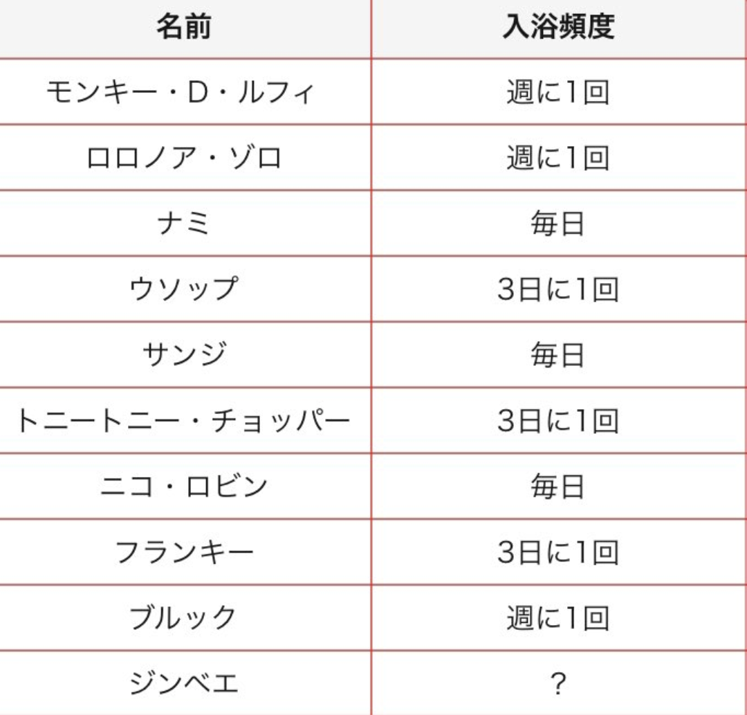 ゾロとか隙あらば修行で汗だくなのに週一とか絶対臭い