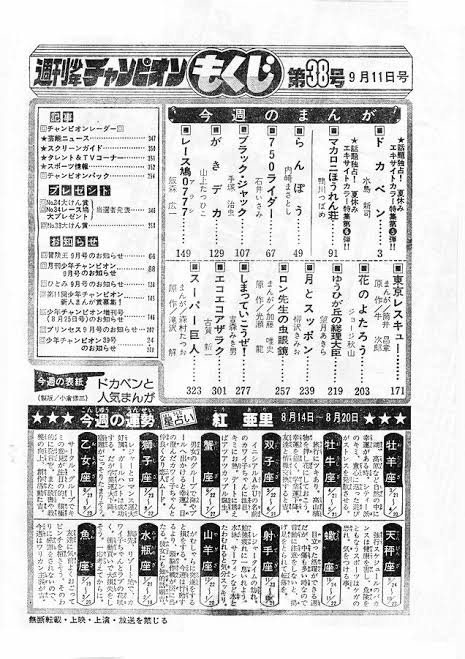 Drスランプ→DB、キン肉マン、キャプテン翼、北斗の拳、キャッツアイ→シティハンター、男塾、聖闘士星矢
