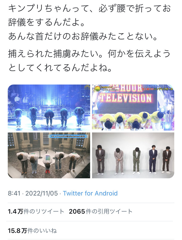 件のお辞儀シーンは、あらかじめ決められていたタイミングとは別に、メンバーの一人が「これからもよろしくお願いします」的なこと言って軽く会釈した時に、周りのメンバーもつられて軽く会釈した、という程度のシーンや。