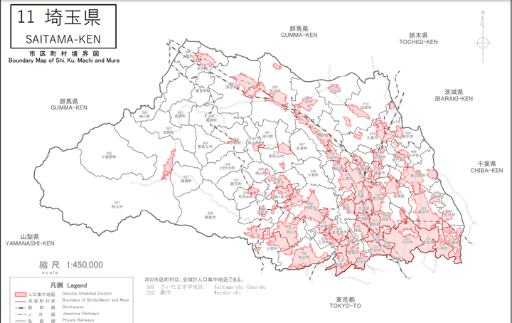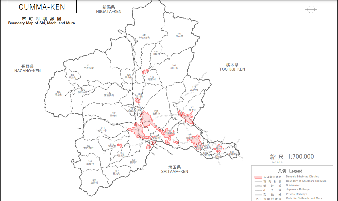 例えば群馬だとこんな感じや。赤色のところが人口集中地区