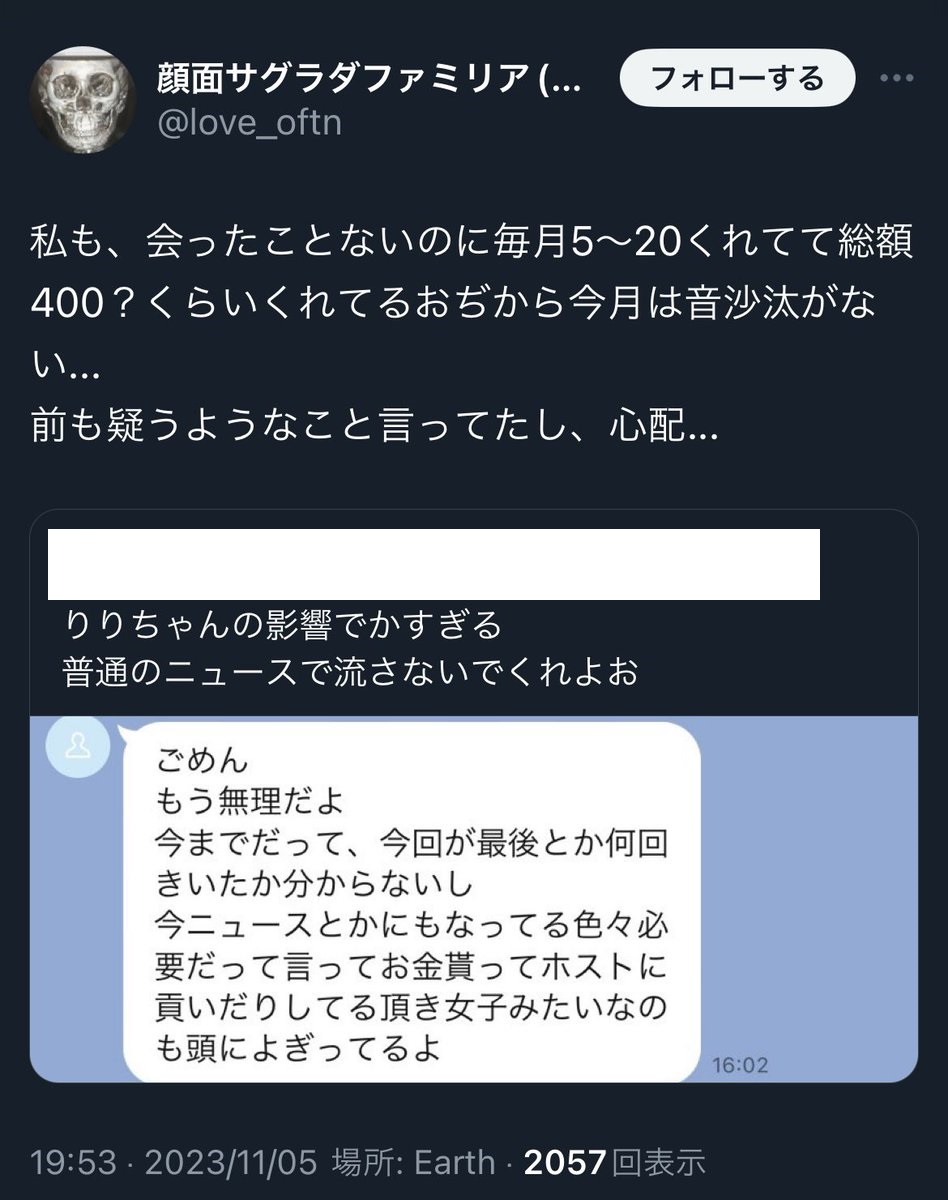 128 名前 : 暇つぶしの名無しさん投稿日:2023年11月10日 10:18 ▼このコメントに返信 会ったことないのにお金渡してるって、どういうことなの??????