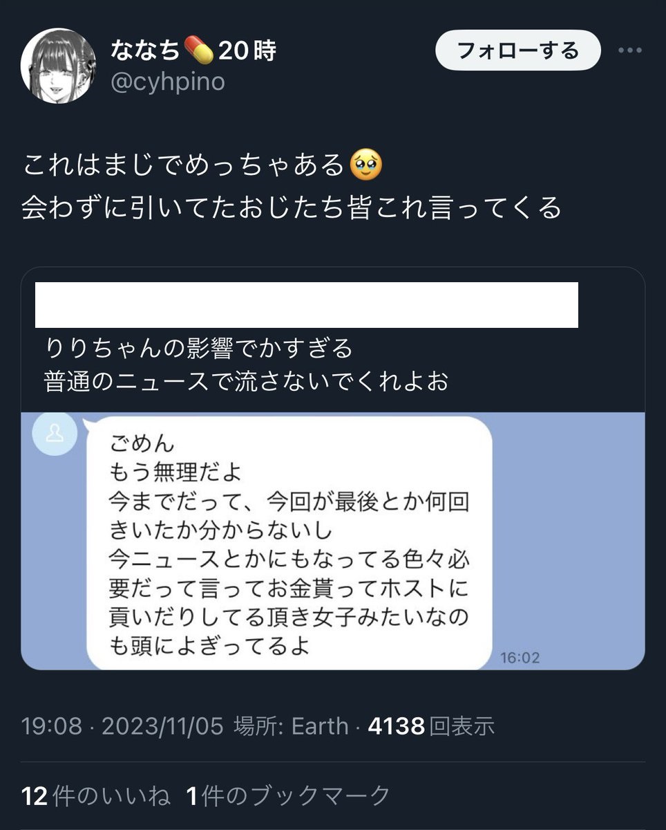 5 名前 : 暇つぶしの名無しさん投稿日:2023年11月08日 06:39 ▼このコメントに返信 おじから金引っ張れなくなるどころか、次はホストが潰される可能性高くなってきたから、金引っ張る方の売女も騙す理由がなくなると思う