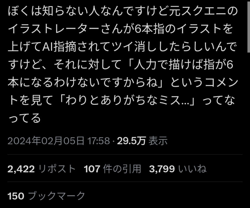まあこれから先「指が6本あるからAI絵だ!」とかなったらそれこそ自分達の首が締まるだけやからな